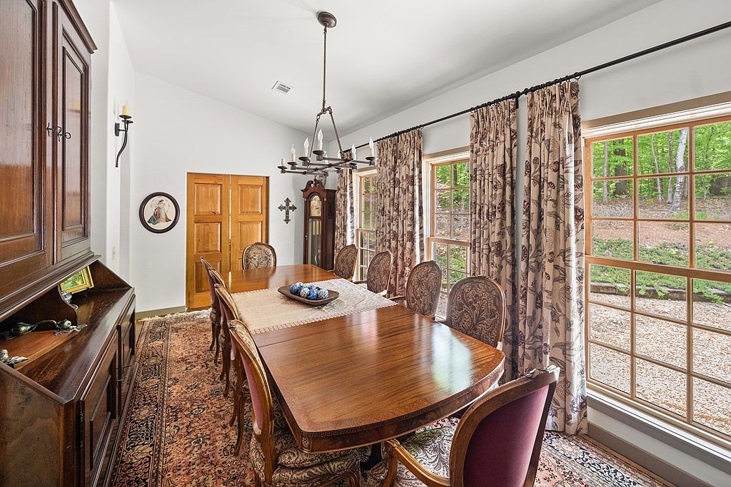 This elegant dining room features a long wooden table surrounded by intricately carved chairs upholstered in patterned fabric, complemented by a large, traditional area rug that anchors the space. Floor-to-ceiling windows line one side, filling the room with natural light and offering a serene view of the lush garden outside. Floral drapes in soft beige and brown hues frame the windows, adding a touch of classic charm. A stately grandfather clock and wall-mounted candle sconces enhance the timeless, warm ambiance, while a simple iron chandelier hangs overhead, completing the refined yet inviting aesthetic.