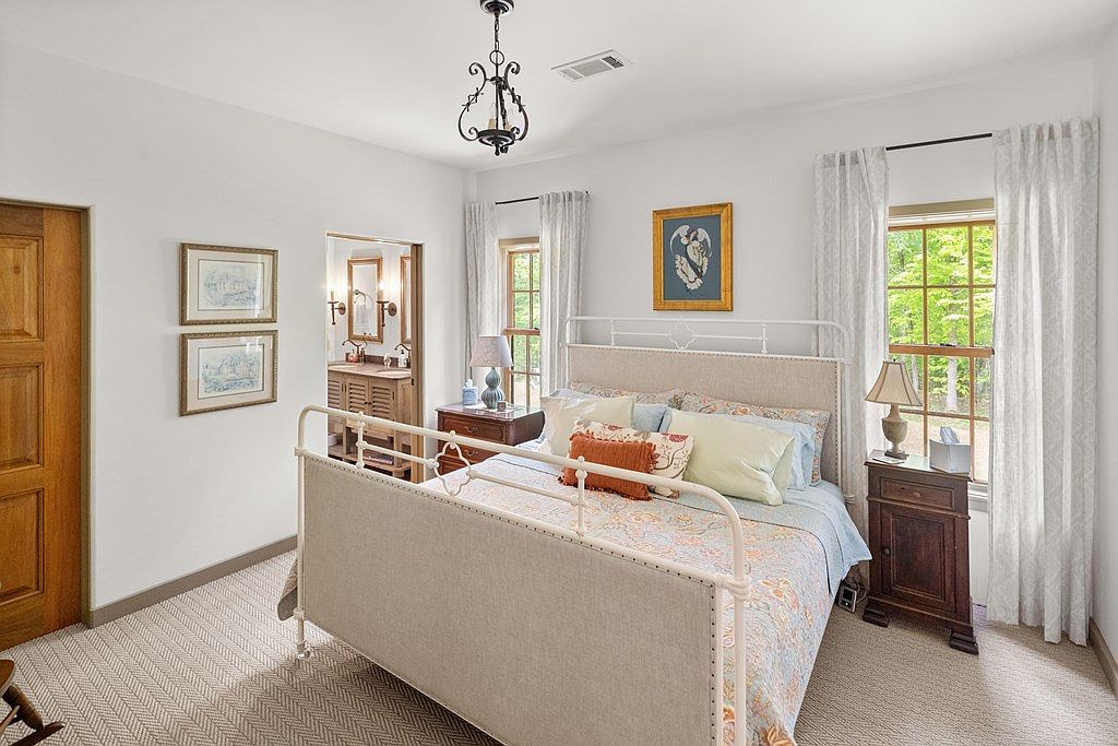 This master bedroom features soft neutral tones with muted beige walls and cream-colored accents, creating a serene atmosphere. The centerpiece is a classic upholstered bed with white metal framing and a detailed headboard and footboard. Bedding includes pastel floral patterns and an array of plush pillows, blending comfort with elegance. Symmetrically placed dark wood nightstands flank the bed, each topped with traditional lamps. Natural light streams through two large windows dressed with sheer white curtains, adding brightness and a view of greenery outside. A subtle patterned carpet adds warmth, while framed art and sconces provide tasteful decor, seamlessly connecting to an adjoining bathroom.