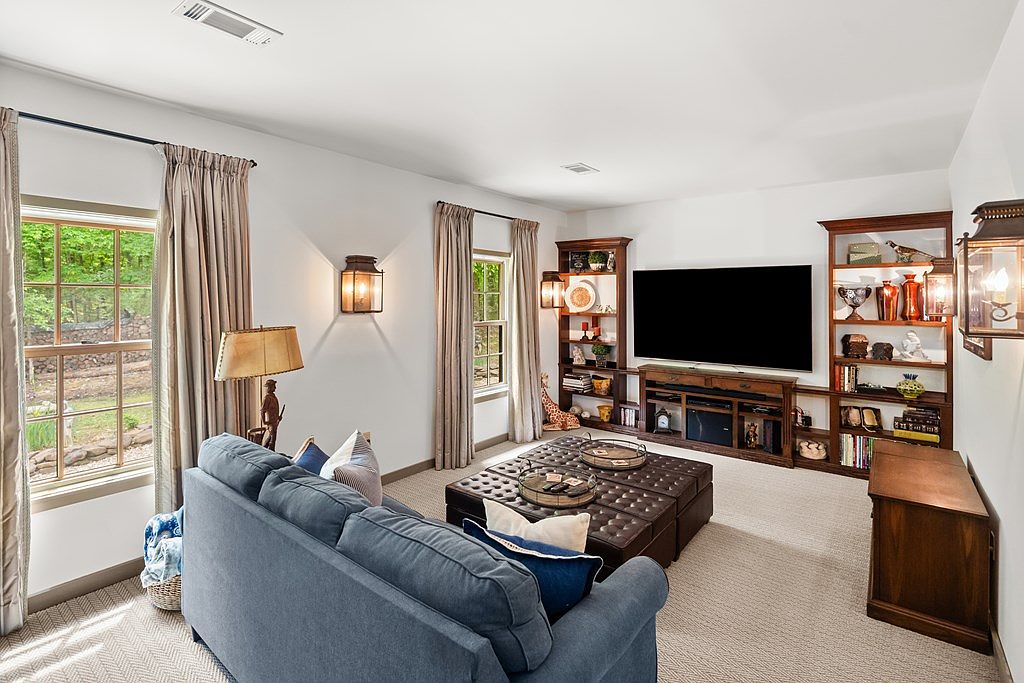 This cozy family room features a balanced layout centered around an entertainment wall with a large flat-screen TV flanked by two tall wooden shelving units, providing ample space for decorative objects and books. The room embraces a neutral color palette with off-white walls and beige carpet flooring that offers warmth and complements the rich wood tones of the furniture. A plush gray-blue sofa faces the TV, adorned with cushions in muted tones for subtle contrast. The tufted, dark leather ottoman doubles as a coffee table, adding texture and function. Soft natural light filters through two large windows dressed in taupe curtains, enhancing the room’s inviting atmosphere. Classic wall sconces and a traditional floor lamp contribute to the room’s warm, homey glow, blending modern comfort with timeless design elements.
