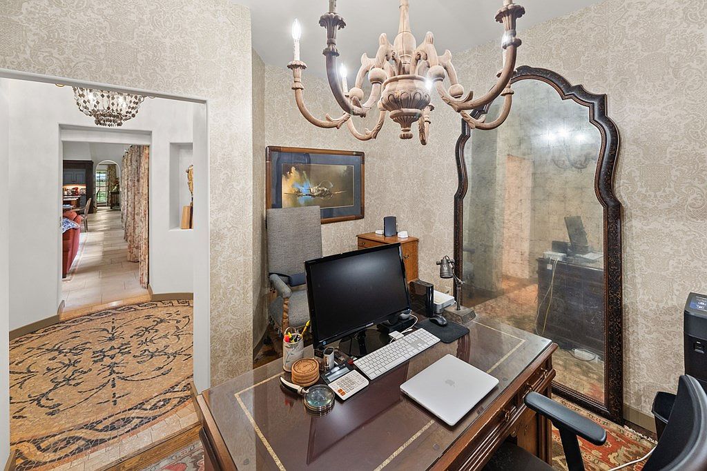 This cozy home office nook features vintage elegance with a richly varnished wood desk boasting inlaid detailing. The workspace is equipped with modern essentials, including a desktop monitor, keyboard, and laptop, skillfully blending contemporary function with classic style. A tall, ornately framed mirror stands behind the desk, amplifying the room’s light and sense of space. The walls are covered in a delicate, patterned wallpaper that compliments the antique chandelier above, adding sophistication. Adjacent to the desk, a high-backed upholstered chair and a decorative framed painting contribute warmth and character, while the adjoining hallway with elegant archways creates a seamless flow.