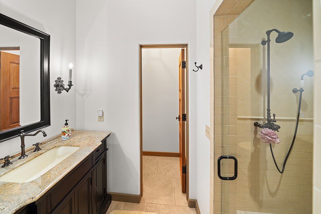 This bathroom features a warm and inviting design with a dark wood vanity topped by a light granite countertop that includes an integrated sink. Elegant black metal fixtures complement the large, black-framed mirror above. Soft, neutral wall colors enhance the natural light and contrast beautifully with the dark trim and vanity. To the right, a glass-enclosed shower with beige subway tile laid in a herringbone pattern showcases classic black shower fixtures, including a rain head and handheld sprayer. The floor is tiled in a coordinating light tan, and wood-trimmed doorways add subtle architectural interest to this refined space.