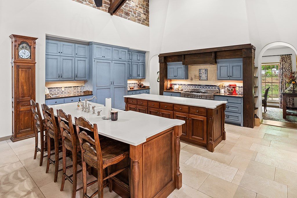 This spacious kitchen features a blend of rustic and classic design elements with warm wood and muted blue cabinetry. The large central island with a white countertop serves both as a workspace and seating area, surrounded by sturdy wooden chairs with carved backs. The blue cabinets, contrasted with dark wood accents, including a substantial wooden kitchen hood frame, add depth and vintage charm. Light beige tile floors complement the neutral walls and enhance the airy feel. A tall wooden grandfather clock adds to the timeless atmosphere, while under-cabinet lighting highlights intricate tile backsplashes. An adjacent arched doorway leads into a formal dining area with large windows, letting in natural light.