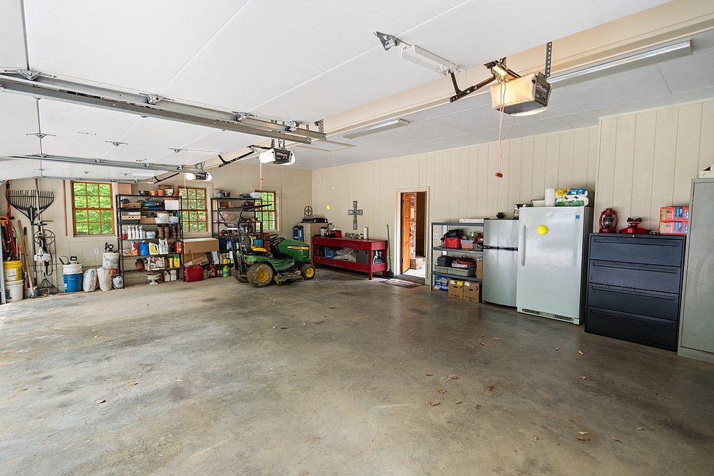 This spacious garage features a practical, utilitarian design with concrete flooring and beige paneled walls. Ample natural light flows in through two side windows, brightening the space. The garage door mechanism is visible on the ceiling, indicating a functional dual-car setup. Along one wall, metal and wooden shelving units are neatly arranged, housing garden tools, containers, and various supplies. A riding lawn mower sits centrally, ready for use. Additional storage includes a white refrigerator, a black filing cabinet, and a set of workbenches, emphasizing the area’s multipurpose role as both storage and a workshop.