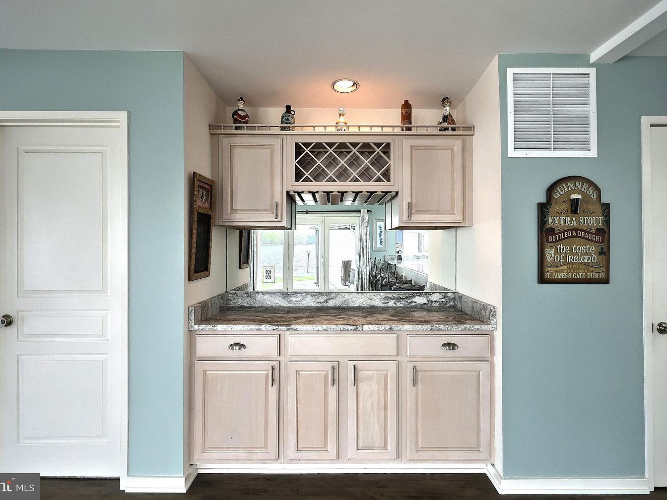 This wet bar area features a compact yet functional design, centered between two white doors against soft teal walls. The cabinetry, painted in a muted cream tone with brushed metal hardware, includes both drawers and cupboards below a polished, marbled countertop. Above, a matching upper cabinet setup integrates a wine rack and bottle storage, framed with a mirrored backsplash that enhances light and reflects a glimpse of an adjoining room. Dark wooden flooring contrasts warmly with the cooler wall and cabinet colors. Subtle decorative accents atop the cabinets add a personal touch, while the Guinness sign brings a hint of rustic pub charm.