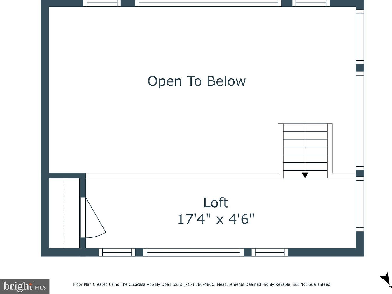 This compact loft space measures approximately 17 feet 4 inches by 4 feet 6 inches, featuring a narrow rectangular layout. It is positioned adjacent to an open area that looks down to the floor below, creating an airy and connected feel. The staircase is at one end of the loft, allowing easy access from the lower level. This area is ideal for a cozy reading nook, small office, or decorative display. The overall design emphasizes openness and natural light, highlighted by windows along the external wall, and the clean, straightforward architectural lines maintain a minimalist, modern aesthetic.