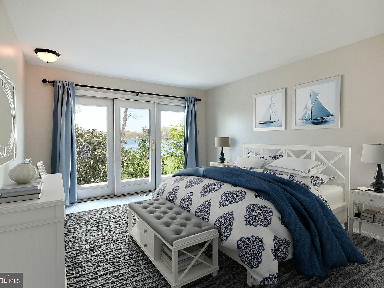 This serene bedroom features a soft neutral palette with pale gray walls that complement the dark patterned carpet. A white wooden bed with a lattice-style headboard sits at the center, dressed in a white comforter decorated with intricate navy blue motifs and topped with a cozy deep blue throw. Matching nightstands frame the bed, each holding dark-based lamps with soft, neutral shades. A cushioned bench with storage sits at the foot of the bed, blending function with comfort. Floor-to-ceiling glass doors open to a stunning lake view, enhancing the space’s natural light and peaceful vibe, while light blue curtains frame the windows and add a gentle splash of color. Nautical-themed artwork above the bed ties the entire look together.