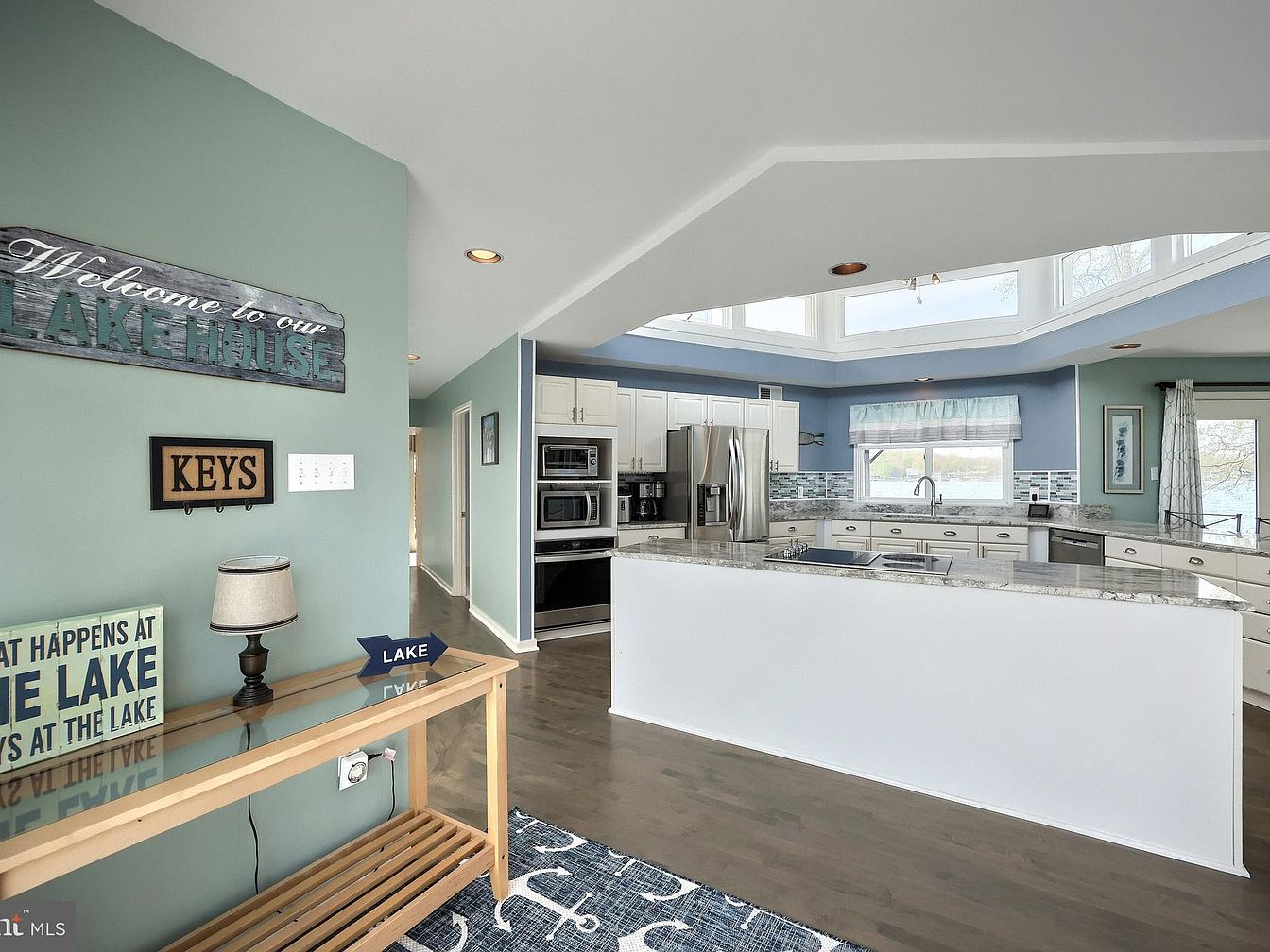 This space features a bright kitchen adjacent to a welcoming entryway, characterized by soft blue-green walls that bring a serene, lakehouse vibe. The kitchen boasts white cabinetry with silver hardware, complemented by a granite countertop island that adds both workspace and seating potential. A mosaic tile backsplash in blue and gray shades enhances the coastal feel, alongside stainless steel appliances including a refrigerator and built-in microwave. Large windows and clerestory windows flood the area with natural light, emphasizing openness. Nautical-themed décor, such as a “Welcome to our Lakehouse” sign and anchor-patterned rug, reinforce the relaxed, lakeside atmosphere.