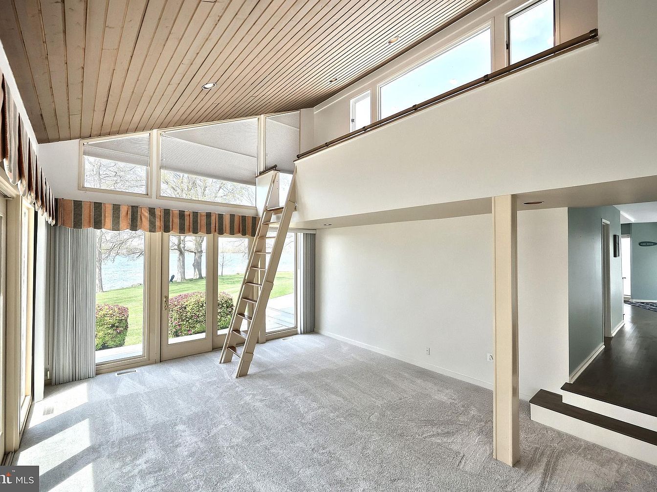 This bright sunroom features expansive floor-to-ceiling windows that overlook a lush green lawn by the water, allowing natural light to fill the space. The room is carpeted in a soft, light gray tone, providing a cozy and inviting atmosphere. A striking wood-paneled ceiling in a natural finish adds warmth and architectural interest, complemented by modern recessed lighting. The standout feature is a loft area accessible by a narrow wooden ladder, enclosed by low walls with horizontal windows above, enhancing the airy feel. Accented with a striped valance above the windows, this space offers serene views and versatile living options.