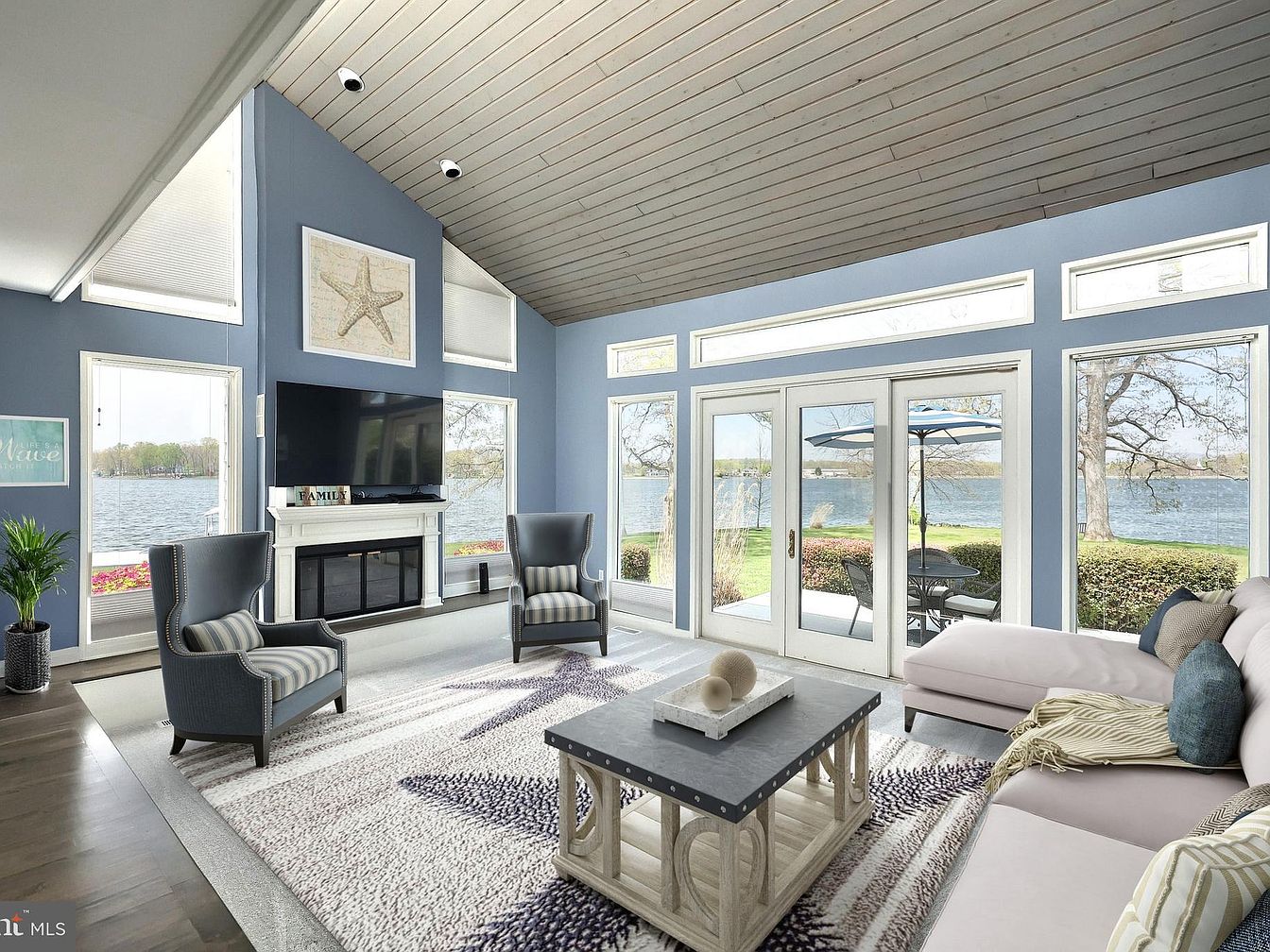 This spacious living room boasts floor-to-ceiling windows and glass doors that provide an expansive view of the serene lake outside, allowing natural light to fill the room. The walls are painted a soothing ocean blue, complementing the coastal vibe, while the vaulted ceiling with narrow wooden panels adds warmth and depth. Seating includes two elegant dark grey armchairs with striped cushions and a large, comfortable L-shaped sectional sofa in a soft beige tone adorned with accent pillows and a cozy throw. A light-toned area rug with abstract starfish patterns anchors the space, while a modern fireplace with a mounted flat-screen TV serves as a focal point. The room seamlessly blends casual comfort with coastal elegance, creating a perfect lakeside retreat.