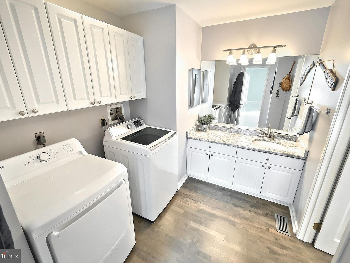 This space combines a practical laundry area with a stylish vanity section, creating a multifunctional room. The laundry side features a white washer and dryer beneath a row of white cabinetry with silver knobs, offering ample storage and maintaining a clean, cohesive look. Adjacent is a vanity with a marble countertop and undermount sink, surrounded by white shaker-style cabinets for additional storage. Above the vanity, a large mirror expands the room’s sense of space, illuminated by a four-light fixture with frosted glass shades. Neutral walls and light hardwood flooring complete the bright, fresh ambiance of the room.