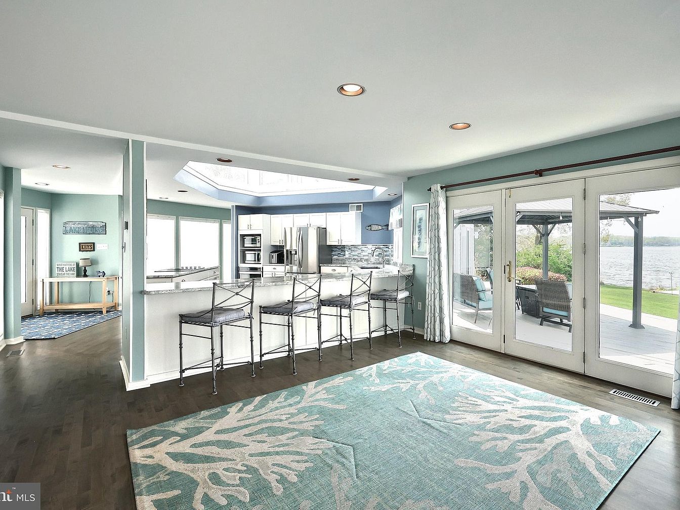 This open-concept kitchen and dining space features soft seafoam green walls complemented by white cabinetry and modern stainless steel appliances, creating a fresh and inviting atmosphere. A white granite countertop breakfast bar is lined with four intricate wrought iron stools, offering casual dining with a view. Natural light floods the room through large windows and glass doors that open onto a lakeside patio, connecting indoor and outdoor living. The wooden floor is adorned with a coordinating aqua blue coral-patterned area rug that enhances the coastal, relaxed aesthetic. Recessed lighting and a large skylight add brightness, emphasizing the airy, spacious feel.