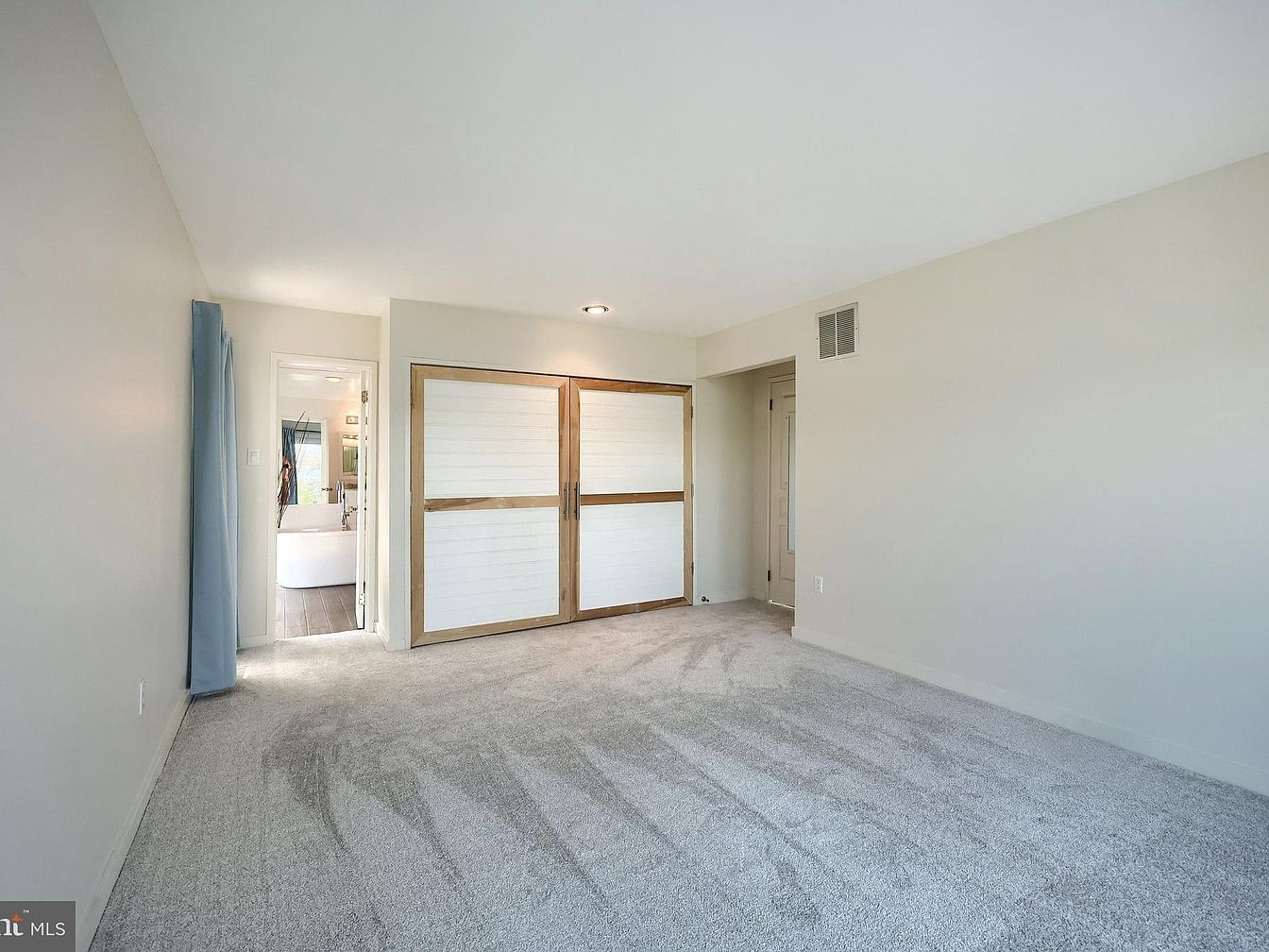 This bedroom offers a serene retreat featuring neutral cream walls that enhance the spacious feel. The light gray carpeting adds a cozy, soft texture underfoot, complementing the calm color scheme. A set of large sliding closet doors combines sleek white panels with natural wood trim, providing a modern farmhouse touch. The ceiling is smooth with a recessed light fixture, giving subtle illumination. To the left, a doorway opens to what appears to be an en suite bathroom, adding functionality. The overall minimalist design emphasizes openness and tranquility.
