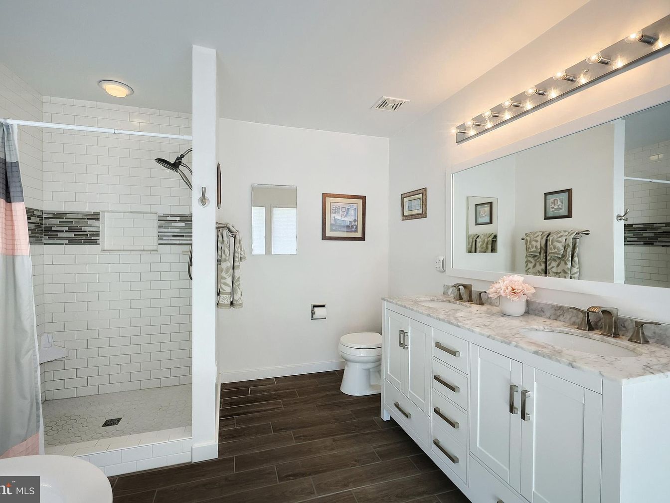 This bathroom features a clean, modern design with a white double vanity topped with a marble countertop. Two sinks sit beneath a large, wall-to-wall mirror framed with bright vanity lights for ample illumination. The floor is covered with dark wood-look tiles, offering a warm contrast to the white walls and cabinetry. A walk-in shower with white subway tiles and a decorative horizontal mosaic tile accent adds subtle visual interest. The space includes simple framed artwork and neatly hung towels, creating an inviting and functional area that blends minimalist elegance with everyday usability.