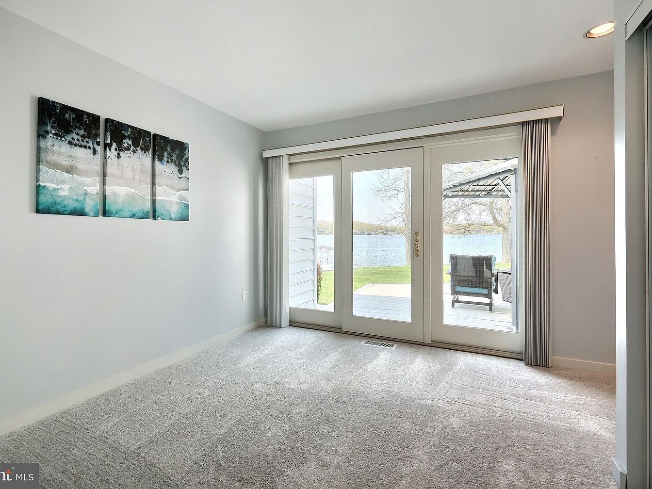 This space features a serene, neutral color palette dominated by soft gray walls and plush light gray carpeting, creating a calm and inviting atmosphere. A triptych piece of ocean-inspired artwork adds a splash of cool blue and white tones, tying in a coastal element with the lake view outside. The wide glass sliding doors open to a patio area and emphasize natural light and picturesque views across the water, connecting indoor comfort with outdoor relaxation. Vertical blinds frame the doors, allowing control over light and privacy. This peaceful corner is perfect for quiet reflection or enjoying the scenic lakefront.