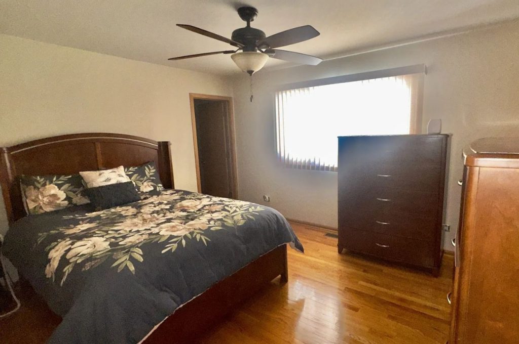 This cozy primary bedroom offers a calm retreat with warm hardwood floors and rich, dark wood furnishings that complement the neutral walls. A large window invites soft natural light into the room, enhanced by vertical blinds for adjustable privacy. The floral bedding adds a touch of elegance and comfort, while the ceiling fan ensures year-round climate control. Perfectly sized and thoughtfully arranged, this room blends restfulness with classic charm.