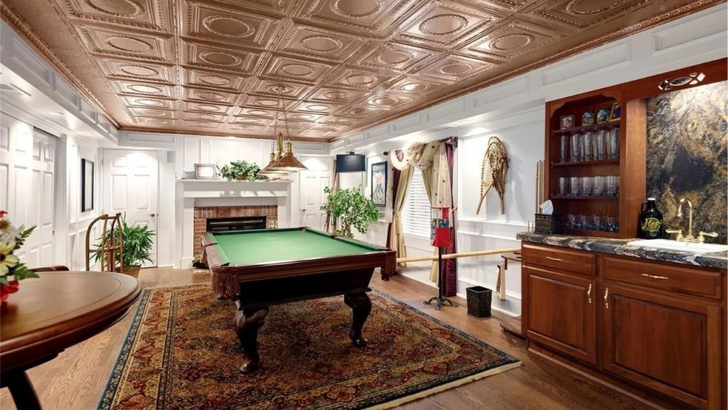 This richly appointed game room pairs old-world style with cozy charm. A copper-toned coffered ceiling adds opulence above a classic green-felt pool table and Persian rug. White wainscoting and warm wood cabinetry frame a granite-topped wet bar, while a brick fireplace and vintage sports accents complete the inviting scene. Perfect for relaxed evenings and refined entertainment.