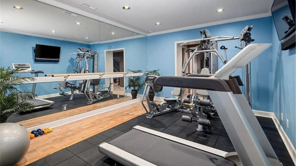 This sleek home gym is both functional and refreshing, with sky-blue walls and mirrored walls that open up the space. Equipped with a treadmill, a weight machine, free weights, and a ballet barre, it offers a versatile workout setup. The black rubber flooring provides grip and durability, while recessed lighting and greenery add a welcoming, upbeat vibe—perfect for a motivating fitness routine right at home.