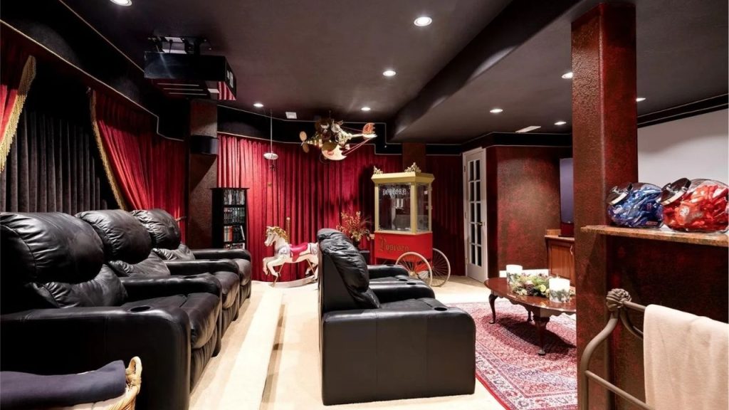 This one-of-a-kind home theater feels like stepping into a vintage movie palace with a playful twist. Plush black leather recliners are perfectly arranged for prime screen viewing, while deep red velvet curtains and moody lighting set the stage. But what really makes it magical? The whimsical touches—a classic popcorn cart, carousel horse, hanging airplane toy, and a candy bar ready for intermission snacking. It’s cozy, nostalgic, and full of character—like a private cinema with a dash of circus magic.