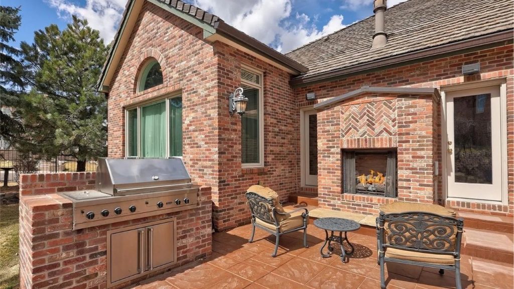 This charming outdoor space features a built-in stainless steel grill set in classic red brick, perfect for outdoor cooking and entertaining. A cozy brick fireplace with a herringbone design adds warmth and character, while cushioned wrought-iron chairs and a café table create an inviting seating area. Surrounded by traditional architecture, it’s an ideal spot for relaxing or hosting in any season.