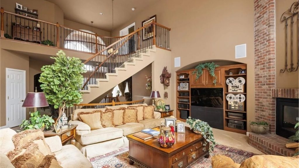 This inviting living room blends comfort and elegance, anchored by plush seating in warm neutrals and framed by rich wood accents. A built-in media center and vintage reel-to-reel display add character beneath soaring ceilings. The curved staircase and open loft above provide architectural interest, while a brick fireplace adds a rustic touch to this timeless gathering space.