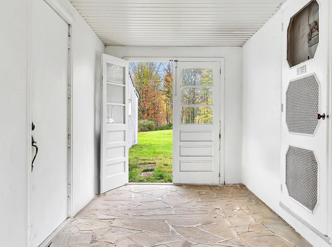 The space is a charming back porch entry featuring rustic stone flooring that adds natural warmth and texture. White walls and a paneled ceiling create an airy, clean backdrop that contrasts the earthy floor. Two large white doors with glass panels open outward to a lush, green backyard bordered by colorful autumn trees, inviting natural light and outdoor views inside. On either side, simple white wooden doors and a louvered utility-style door with hexagonal mesh compartments emphasize function and vintage character, blending simplicity with subtle architectural charm.