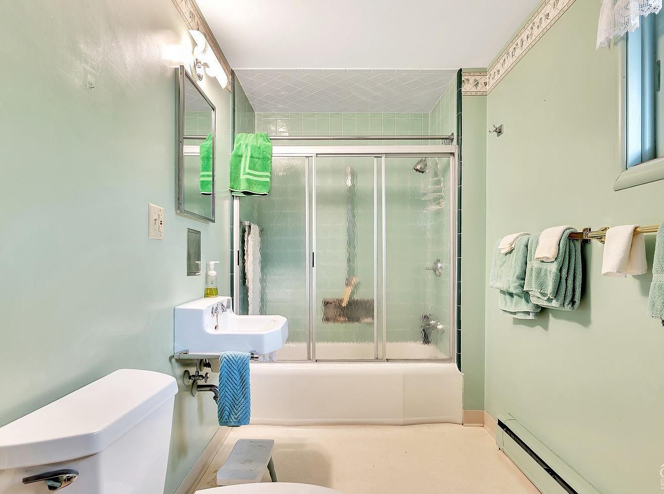 This bathroom features a soft sage green color palette, offering a serene and calming atmosphere. The layout is practical, with a white toilet in the foreground and a small wall-mounted sink beside it, complete with a blue hand towel. The main focus is the bathtub with sliding glass doors that have a textured, frosted finish, surrounded by matching sage green tiles extending to the ceiling. Above the tub, a silver towel bar displays green towels harmonizing with the walls, while a smaller window allows natural light filtered by lace curtains. A gold-toned towel rack holds additional towels, lending a touch of warmth to the space. The space combines vintage charm with simple, functional elements in a cohesive design.