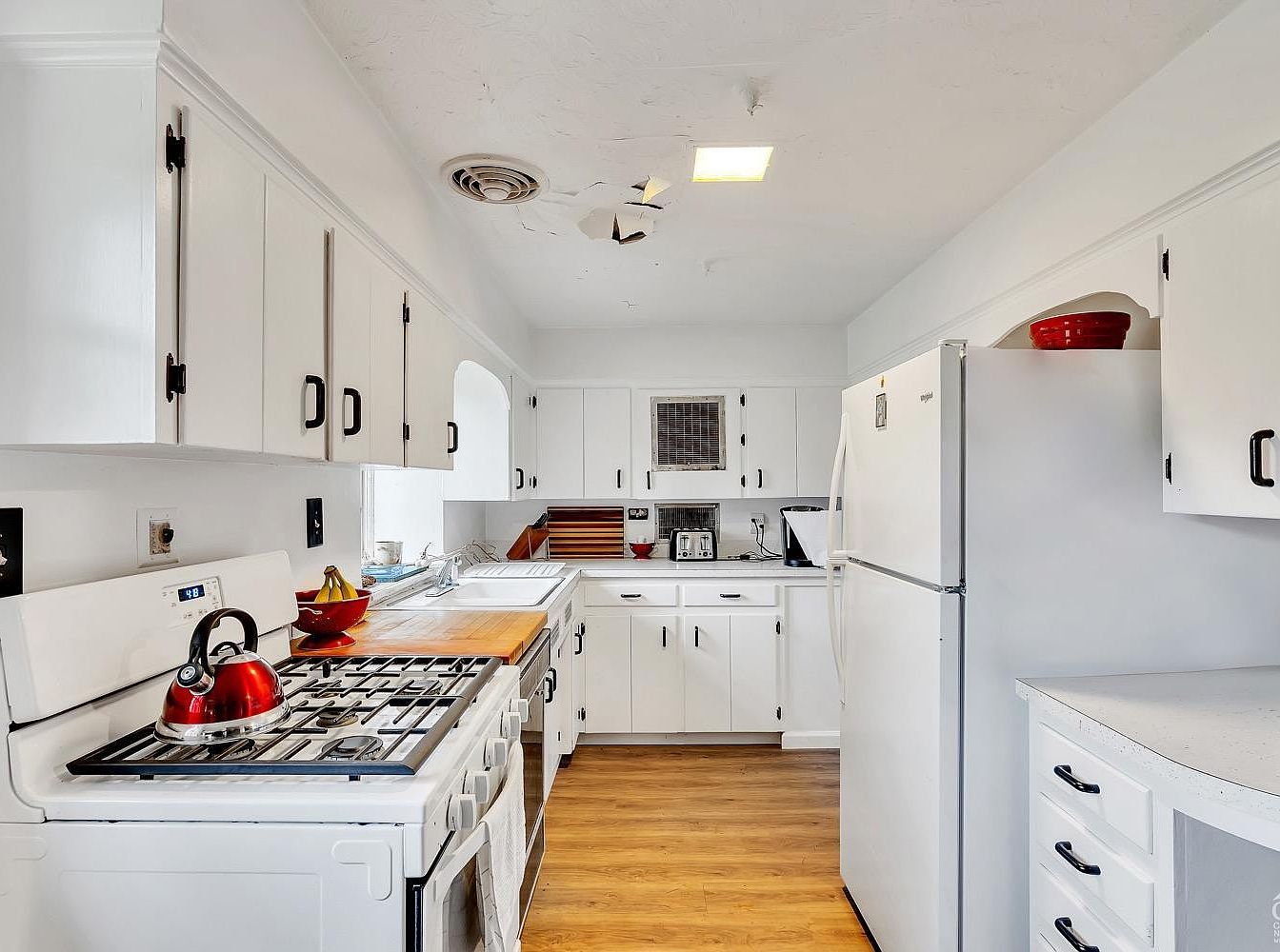 This compact kitchen features a classic design with white cabinetry and black hardware creating a clean, timeless look. The cabinetry extends along two walls, providing ample storage and workspace, while a white refrigerator and stove with a red kettle add subtle pops of color. Natural wood flooring introduces warmth against the predominantly white theme. The layout is efficient, with a sink positioned beneath a window, allowing natural light in, and a countertop adjacent to the stove for food preparation. The ceiling shows some wear, with peeling paint near a vent, suggesting a need for minor repairs.