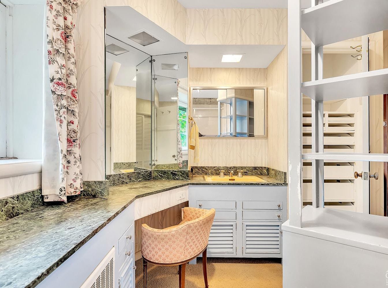 This cozy vanity area features a curved green marble countertop that extends beneath a trio of angled mirrors, designed to provide ample reflection from multiple angles. The cabinetry, painted in soft pale blue with louvered doors, offers storage beneath the counter. A cushioned, peach-patterned chair with wooden legs adds a touch of warmth and comfort. The walls are covered in a delicate beige wallpaper with subtle botanical patterns, complemented by a floral curtain framing a single window, which allows natural light to brighten the space. Architectural details include a built-in light fixture above the sink and open shelving visible on the right side, creating a charming and functional dressing nook.