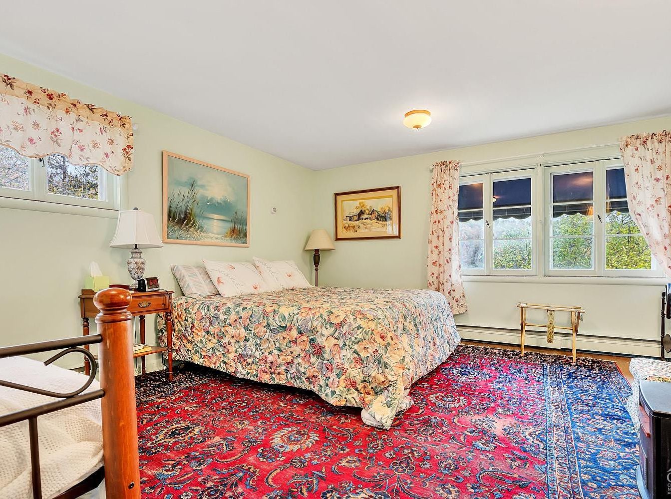 This serene bedroom features soft green walls creating a calm backdrop for the vintage decor. A king-sized bed is dressed in a floral comforter complemented by matching pillows and curtains that frame large windows, allowing abundant natural light. The red and blue Persian-style area rug adds warmth and intricate pattern to the hardwood flooring. Furnishings include a wooden nightstand with a decorative lamp and a small wooden bench near the window. Artworks depicting natural and rustic scenes enhance the cozy, classic aesthetic, blending traditional charm with inviting comfort in this restful retreat.