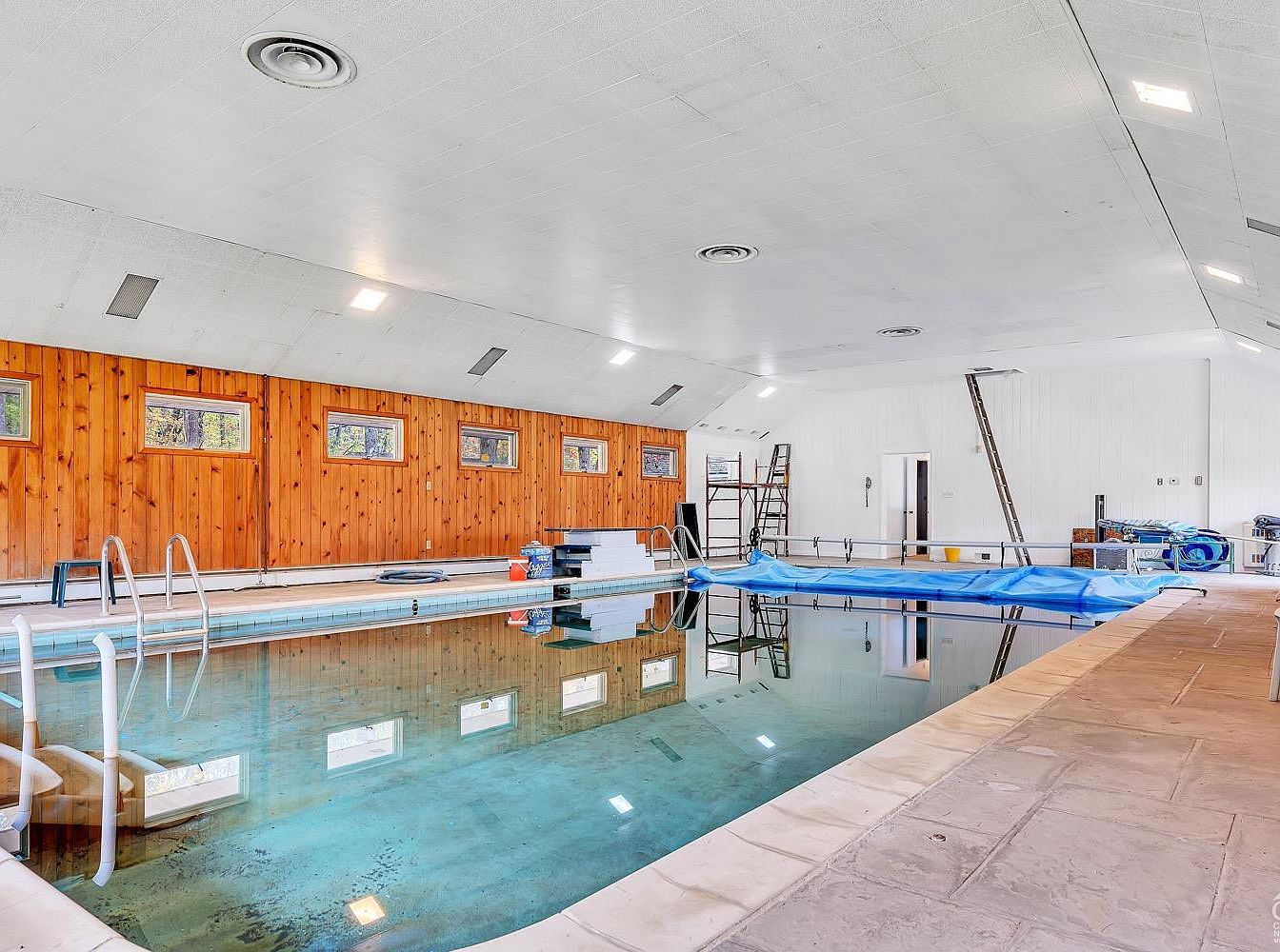 This spacious indoor pool area features a rectangular pool with clear, inviting water. The right side of the pool is partially covered with a blue pool cover, hinting at ongoing maintenance or seasonal protection. The room showcases a mix of warm and neutral tones, with one wall clad in vertical wood paneling with small rectangular windows evenly spaced near the ceiling, providing natural light and a cozy contrast to the white painted walls. The ceiling is plain white with integrated lighting and ventilation vents, and the light-colored stone tile surrounds the pool, offering a durable, slip-resistant surface. Practical metal ladders at both ends ensure easy access, while some pool equipment and storage items are neatly arranged in the background, suggesting a functional and well-maintained recreational space.