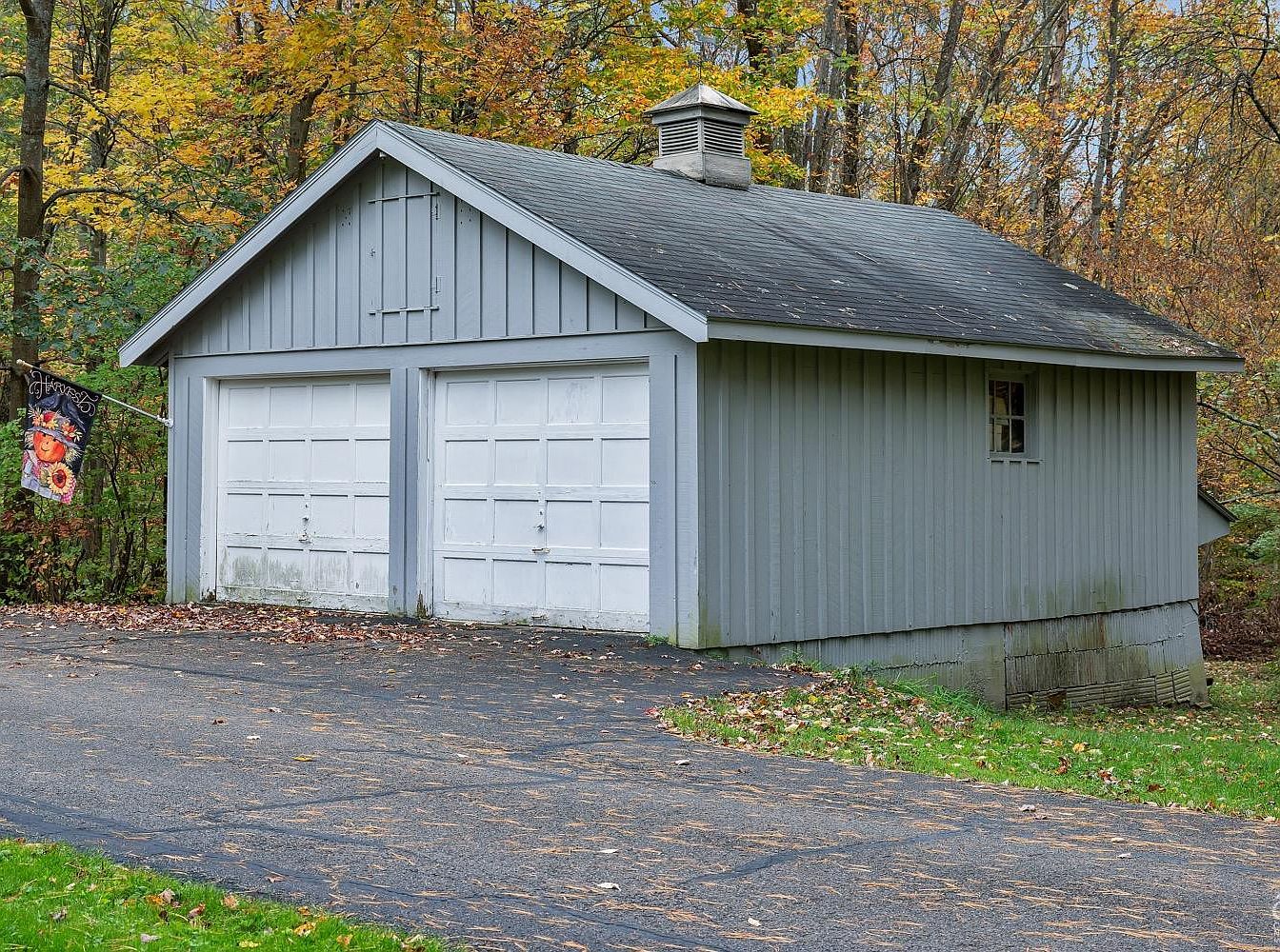 This charming detached garage is painted in a muted gray with white paneled doors, providing a classic and understated look. The structure features vertical siding and a pitched roof with a small cupola that adds character and ventilation. The driveway leading to the two-car garage is paved, bordered by lush green grass, and flanked by autumnal trees, creating a warm seasonal ambiance. The rustic flag with harvest motifs adds a welcoming touch, enhancing the cozy, countryside aesthetic of this outbuilding, blending practical function with subtle decorative elements amidst a natural setting.