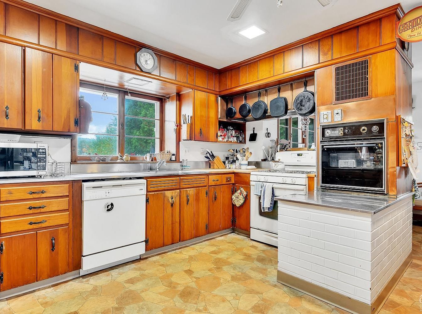 This cozy kitchen corner features rich, warm wood cabinetry with classic black iron handles, complementing the honey-toned parquet flooring. The cabinetry surrounds a bright window that invites natural light, framed in matching wood trim. Below, a white dishwasher and a gas stove offer practical functionality, while an old-fashioned built-in oven encased in a white brick-faced peninsula adds vintage charm. A collection of cast iron pans neatly hang above the stove, reflecting a rustic, homey vibe. The stainless steel countertops provide a clean and durable workspace, blending old-school style with practical modern elements.