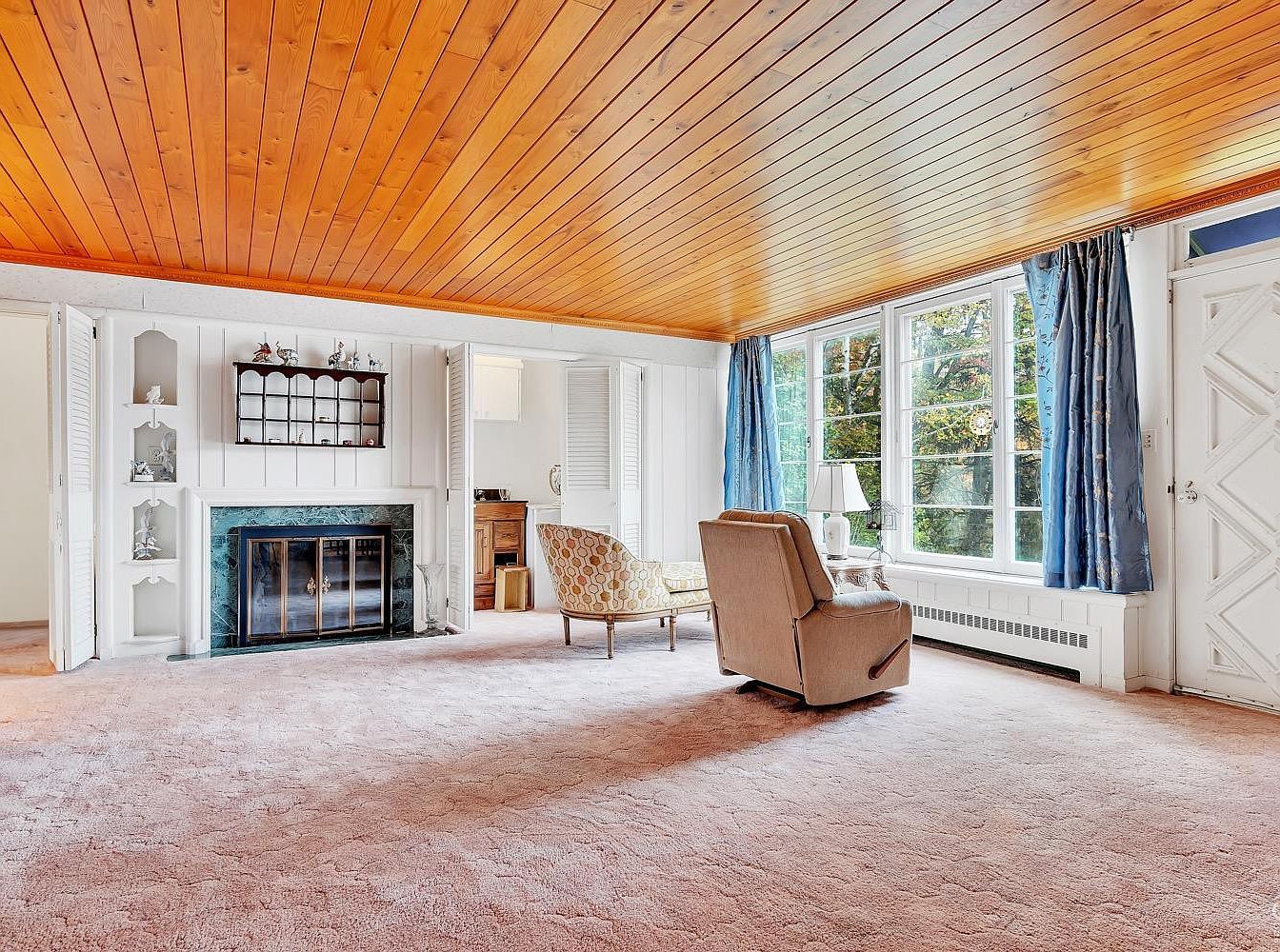 This living room features a spacious layout with vintage charm, highlighted by a warm, polished wooden ceiling that contrasts with soft pastel carpeting. The walls are painted white with built-in shelving flanking a marble-framed fireplace, adding a classic centerpiece. Large windows with blue curtains invite abundant natural light, brightening the neutral and cozy space. The furniture includes a patterned mid-century chaise lounge and a recliner, positioned to enjoy the fireplace view. The white front door with geometric panel details, along with light-colored tone furnishings, creates an inviting and calm atmosphere.