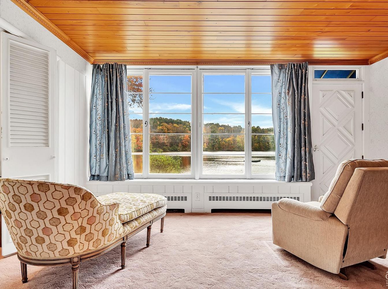 This serene sunroom features a warm wooden ceiling that contrasts elegantly with the soft, light pink carpeting underfoot. Dominating one wall, large white-framed windows offer expansive views of a tranquil lake and forested hillside, inviting natural light to fill the space. Flanking the windows, light blue curtains with subtle floral embroidery add a touch of refined softness. Seating includes a vintage-style chaise lounge with a geometric patterned upholstery in beige and gold tones, and a matching beige recliner, both oriented to take full advantage of the scenic outdoors, blending comfort with classic charm.