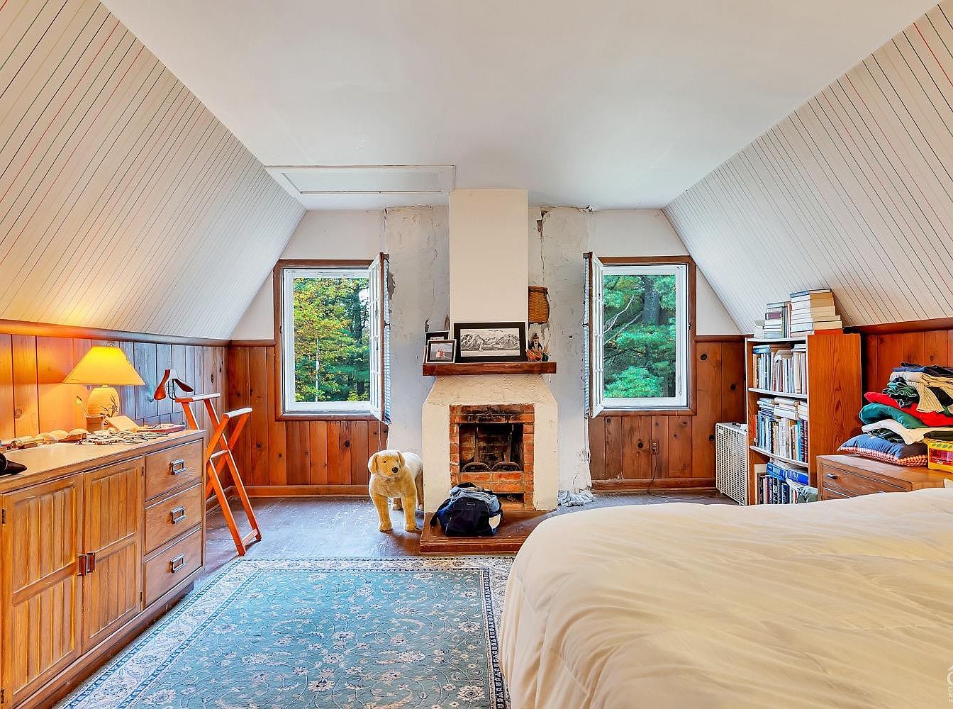 This charming attic bedroom features distinct sloped ceilings with white wooden paneling above warm, honey-toned wood wainscoting that wraps the room, adding rustic charm. Two open windows flank a central brick and plaster fireplace, bringing natural light and a touch of vintage character. A light blue, patterned area rug adds softness to the wooden floor. Furnishings include a low wooden dresser with a table lamp, an orange luggage rack, and a wooden bookcase filled with books and folded clothing, complementing the warm, lived-in feel of the space. The visible bed is dressed in crisp white linens, enhancing the room’s tranquil, cozy ambiance.