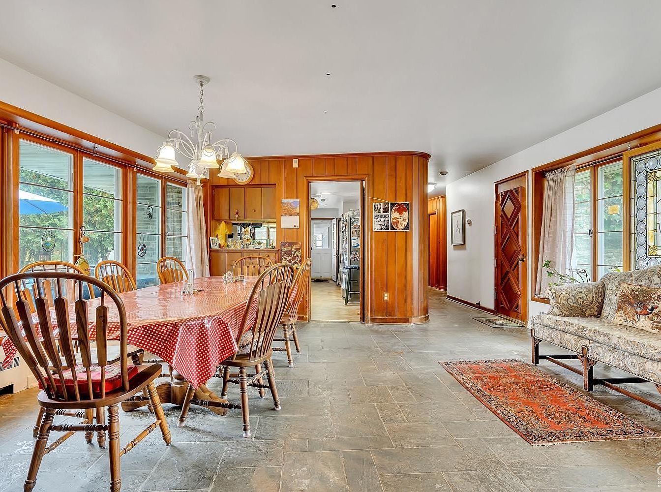 This spacious dining area features a long wooden table draped in a red and white checkered tablecloth, surrounded by classic wooden spindle-back chairs. Natural light pours through large windows framed in warm wood, enhancing the inviting atmosphere. Adjacent to the dining area, a wooden paneled wall with built-in cabinetry and a pass-through window provides seamless connectivity to the kitchen. The open entry hallway leading to the front door displays intricate wood detailing on the door, a patterned area rug on gray stone tile flooring, and a floral upholstered sofa beneath a stained-glass inset window, blending rustic charm with mid-century elements.