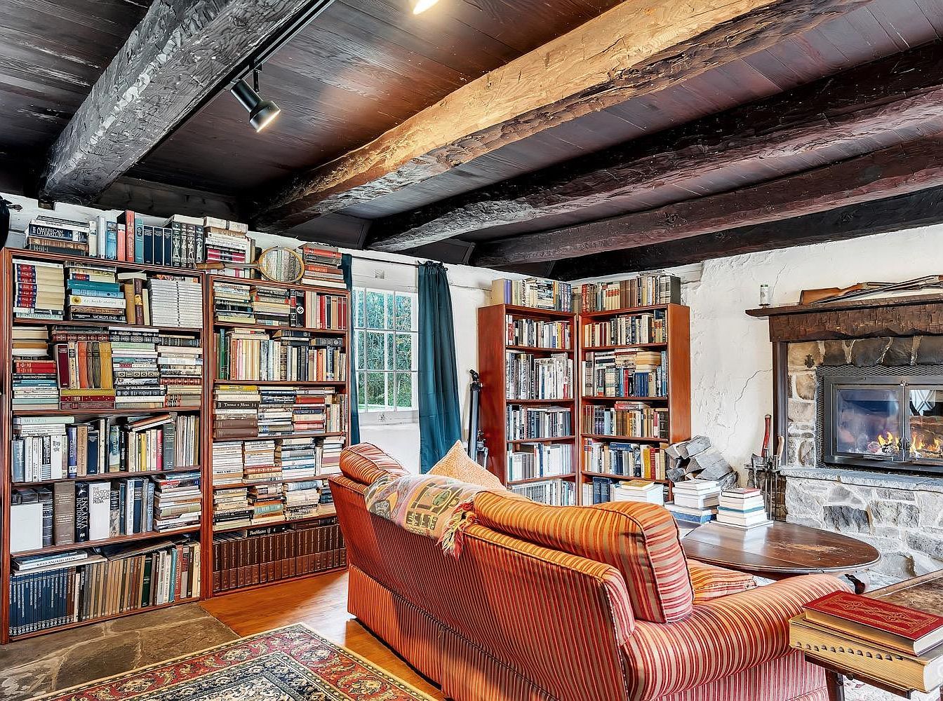 This inviting reading nook boasts rustic charm with exposed dark wooden beams contrasting against white textured walls. The space features multiple wooden bookshelves overflowing with a rich collection of books, creating a bibliophile’s haven. A large window draped in deep teal curtains brings natural light to the room, complementing the warm earthy tones of the hardwood floor and patterned area rugs. A striped red sofa sits facing a stone fireplace framed by a wooden mantel, enhancing the cozy ambiance. Stacks of books on the coffee table and side tables complete the literary and comfortable atmosphere.