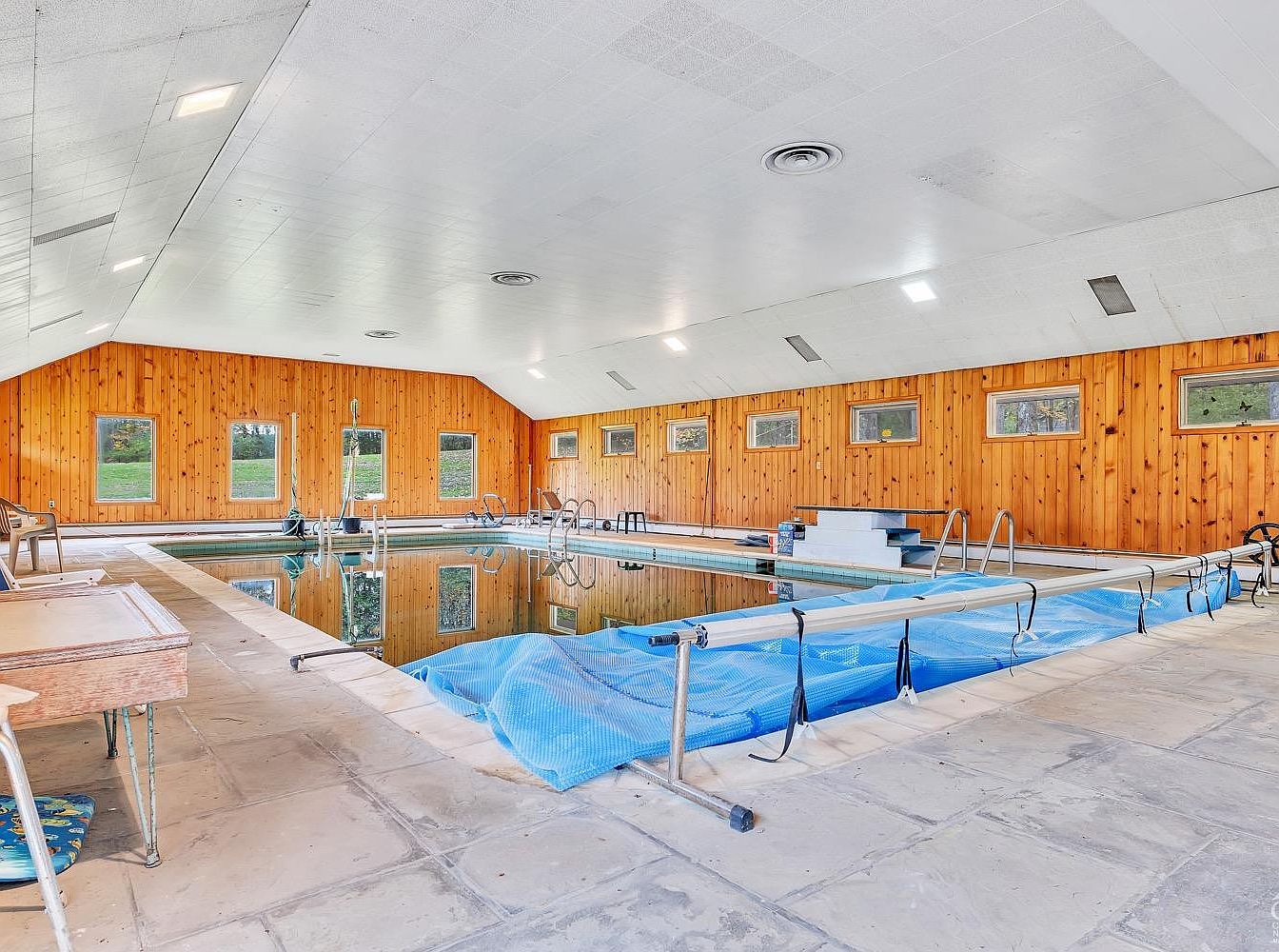 This spacious indoor pool area features warm wooden paneled walls that contrast with the crisp white ceiling, creating a cozy yet open atmosphere. The pool is centrally located with steps and handrails for easy access, surrounded by a wide tile deck that accommodates seating and poolside furniture. Multiple horizontally-aligned windows add natural light and offer scenic outdoor views. The ceiling incorporates recessed lighting and circular vents, ensuring good ventilation and illumination. Blue pool cover material is partially rolled up on one side, indicating care and maintenance of the pool space. Overall, it combines functionality with rustic charm.