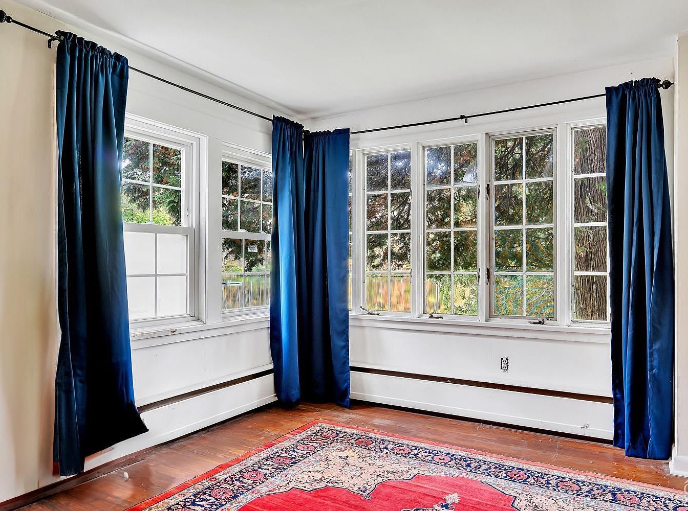 This cozy sitting nook features a charming bay window arrangement that invites abundant natural light, framed by deep navy blue curtains hanging from a simple black rod. The white walls and window trims create a clean, bright backdrop highlighting the lush greenery visible outside. The warm wood floor adds earthiness to the space, complemented by a richly patterned area rug in bold reds and intricate floral designs, infusing a classic touch. The layout suggests an inviting spot for relaxation or reading, embracing serene outdoor views with a balanced blend of traditional elegance and comfort.