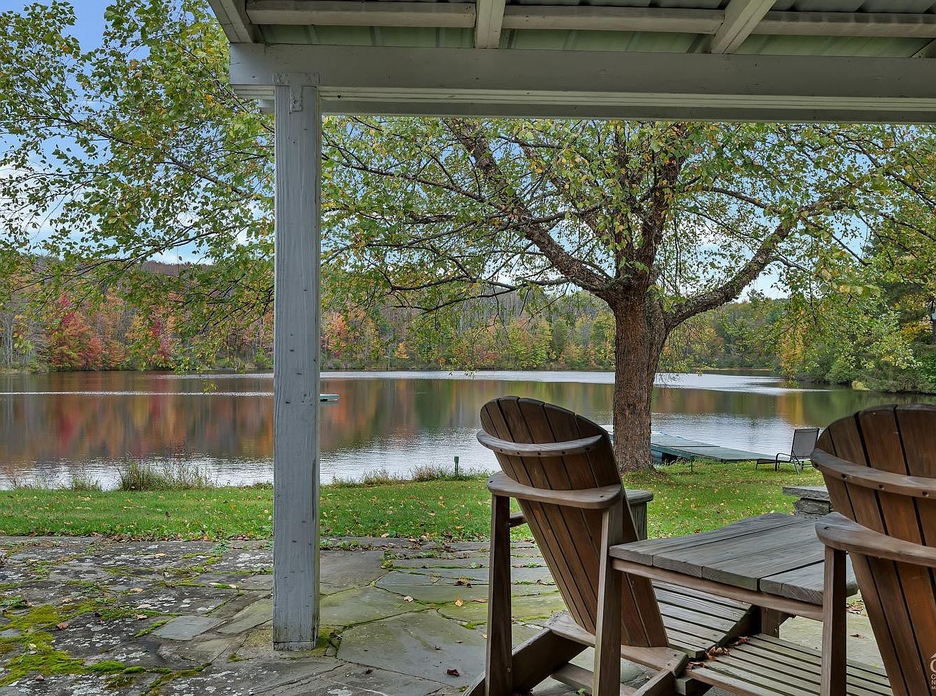 This peaceful outdoor patio area is tucked beneath a covered porch roof, offering shelter while allowing uninterrupted views of a serene lake. Two wooden Adirondack chairs and a matching table invite relaxation and quiet contemplation. The natural stone flooring, sprinkled with patches of moss, enhances the rustic charm and blends seamlessly with the surrounding nature. A mature tree stands near the water’s edge, its branches extending over the calm lake, whose surface reflects the autumn foliage on the opposite shore. The scene radiates tranquility, perfect for enjoying nature’s beauty and fresh air.