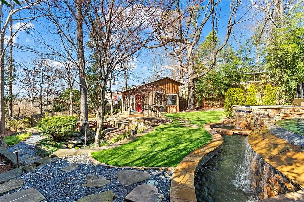 This serene backyard invites relaxation with its lush green lawn bordered by a smooth, curving stone pathway. A rustic wooden shed with a red door anchors the space, blending naturally with the surrounding tall, leafless trees and vibrant shrubs. The stone retaining wall doubles as a soothing water feature, where flowing water gently cascades into a narrow, stone-lined pool below. The garden’s design balances natural elements and clean lines, creating a peaceful outdoor retreat framed by a blend of mature trees, evergreens, and manicured landscaping. This area offers a perfect blend of nature and comfort.