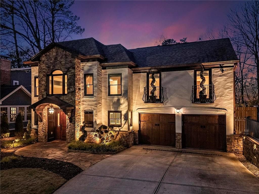 The facade features a charming blend of rustic stone and smooth stucco walls, creating an inviting Mediterranean-inspired aesthetic. The entrance is marked by a covered porch with an arch supported by stone pillars under a warm lantern light. On the right, two dark wood garage doors provide contrast against the lighter exterior. Above the garage are two windows each framed by wrought iron Juliet balconies displaying decorative topiary plants. The roof is steep and shingled, complementing the natural surrounding trees and dusky sky, while soft landscape lighting highlights the house’s textured surfaces and shrubbery around the front yard.