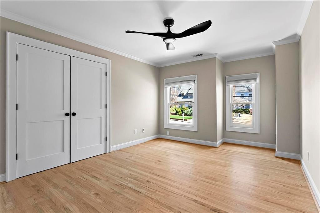 This bright bedroom features a clean and modern aesthetic, showcasing light beige walls that complement the natural light streaming through two rectangular windows. The windows offer views of a quiet suburban street and allow ample daylight to fill the room. Light-colored wood flooring adds warmth and texture beneath sleek white twin doors with black hardware, leading to a closet space. A striking contemporary black ceiling fan with a minimalist design is centrally mounted, enhancing the room’s air circulation while adding a bold contrast to the soft, neutral palette. Crown molding and white baseboards provide a polished, finished look, emphasizing the room’s simplicity and elegance.