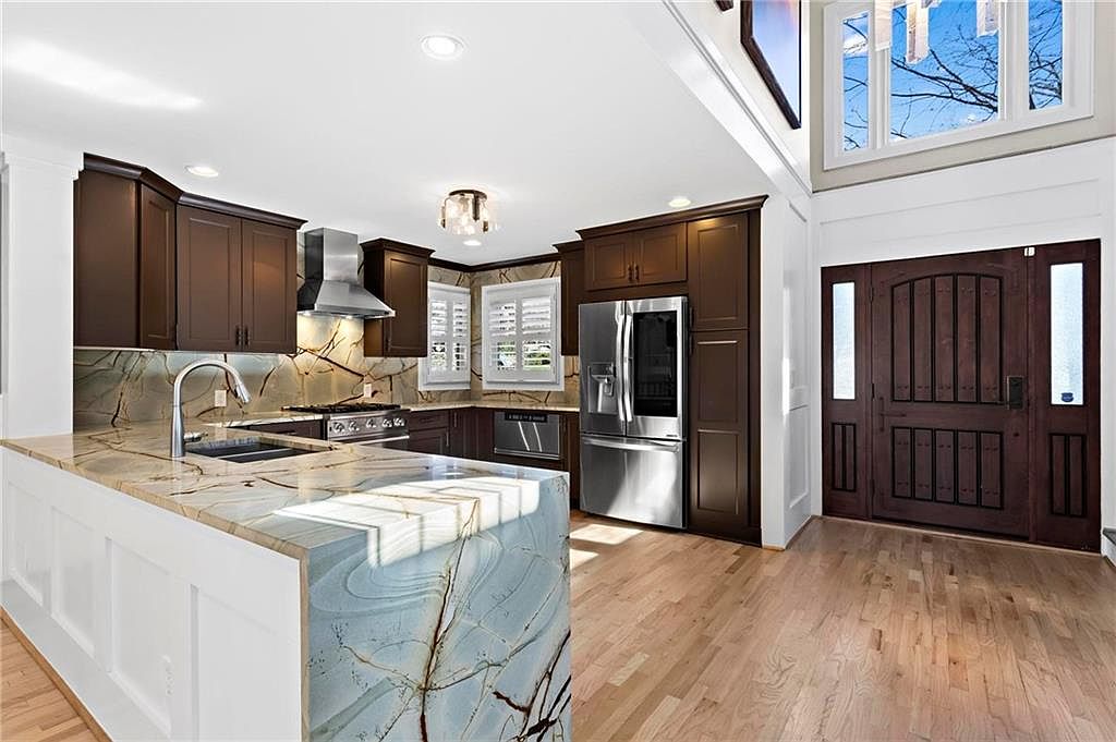 The space features an open kitchen seamlessly blending into the entryway, creating a welcoming and functional layout. Rich dark wood cabinets contrast with the striking marble countertops and backsplash that display natural veining and earthy tones, adding depth and elegance. Stainless steel appliances, including a large fridge and a modern range hood, contribute to a sleek, contemporary feel. The warm, light hardwood flooring balances the darker elements, guiding the eye toward the robust wooden front door, which has decorative paneling and side glass windows that let in ample natural light. The high ceiling with upper windows enhances openness and brightness in this stylish transitional area.