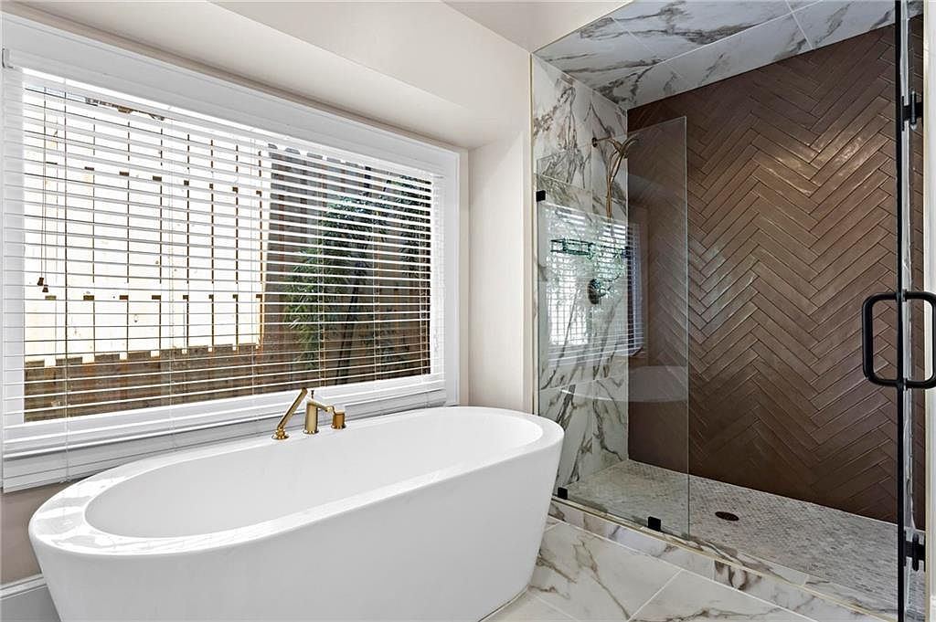 This bathroom features a contemporary design with a sleek, freestanding white bathtub positioned under a large window fitted with white blinds, allowing for adjustable natural light. Adjacent to the tub is a spacious walk-in shower enclosed with clear glass doors. The shower walls combine luxurious white marble tile with bold, dark brown tiles arranged in a striking herringbone pattern, creating a rich contrast. The floor carries the elegance of marble tiles, enhancing the cohesive, high-end aesthetic. Brass fixtures on the tub add a touch of warmth and sophistication, balancing the cool tones of the space.
