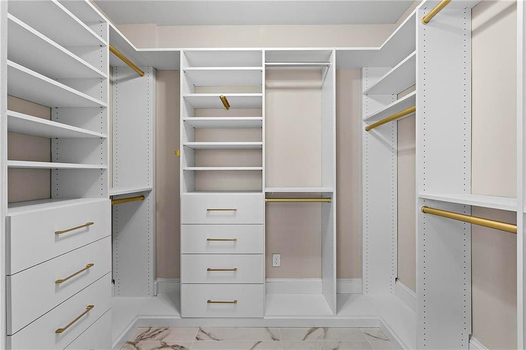 This walk-in closet features a clean, organized layout with multiple white laminated storage units, including open shelves, drawers, and hanging rods. Accents of brushed brass on the drawer handles and clothing rods add a touch of elegance and warmth to the neutral palette. The walls are painted a soft taupe, complementing the polished marble floor tiles that display natural veining for subtle visual interest. The space is designed to maximize storage efficiency with an emphasis on both functionality and style, offering a sophisticated and airy feel perfect for organizing clothing and accessories.