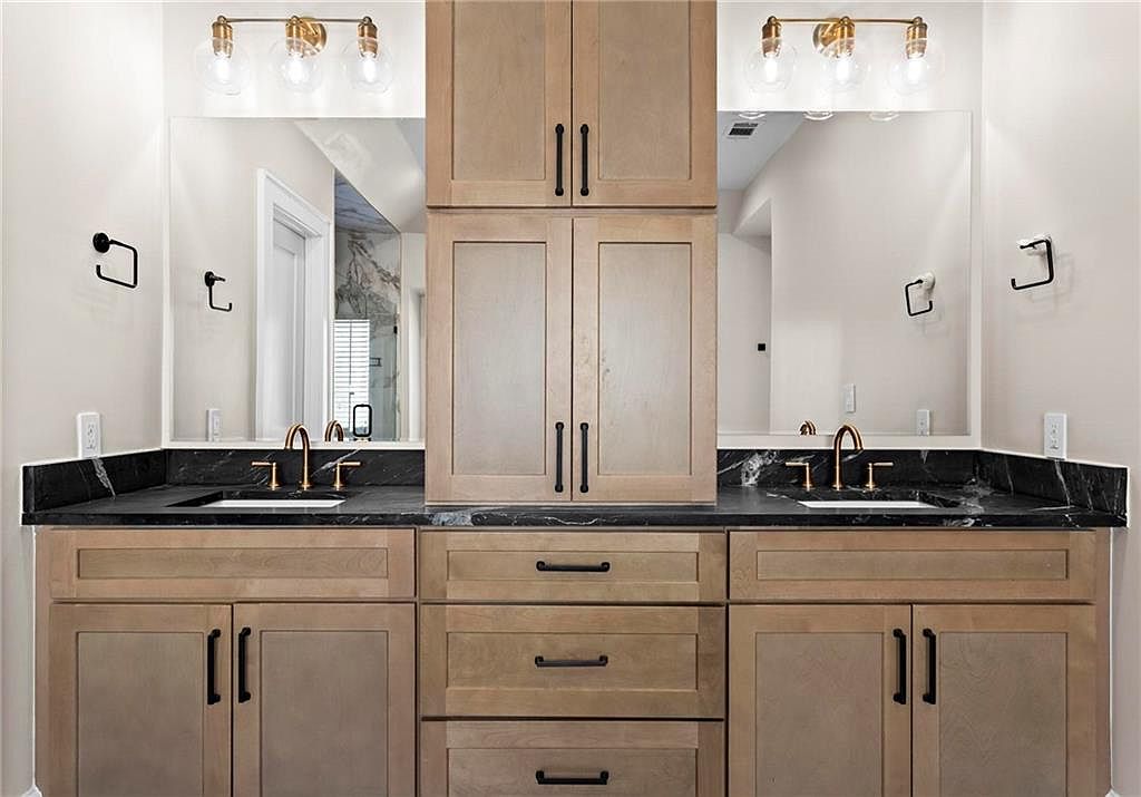 This bathroom features a spacious double vanity with a central column of storage cabinets and drawers, combining functionality and clean design. The cabinetry showcases a natural wood finish with matte black hardware, which contrasts beautifully with the polished black marble countertop that has subtle white veining. The two under-mount sinks each have sleek, modern bronze faucets. Large frameless mirrors extend across each sink, enhancing light and space perception. Above each mirror, there are light fixtures with exposed bulbs housed in clear glass and bronze accents, complementing the faucet finish. The walls are painted a soft, neutral tone, creating a calm and inviting atmosphere.