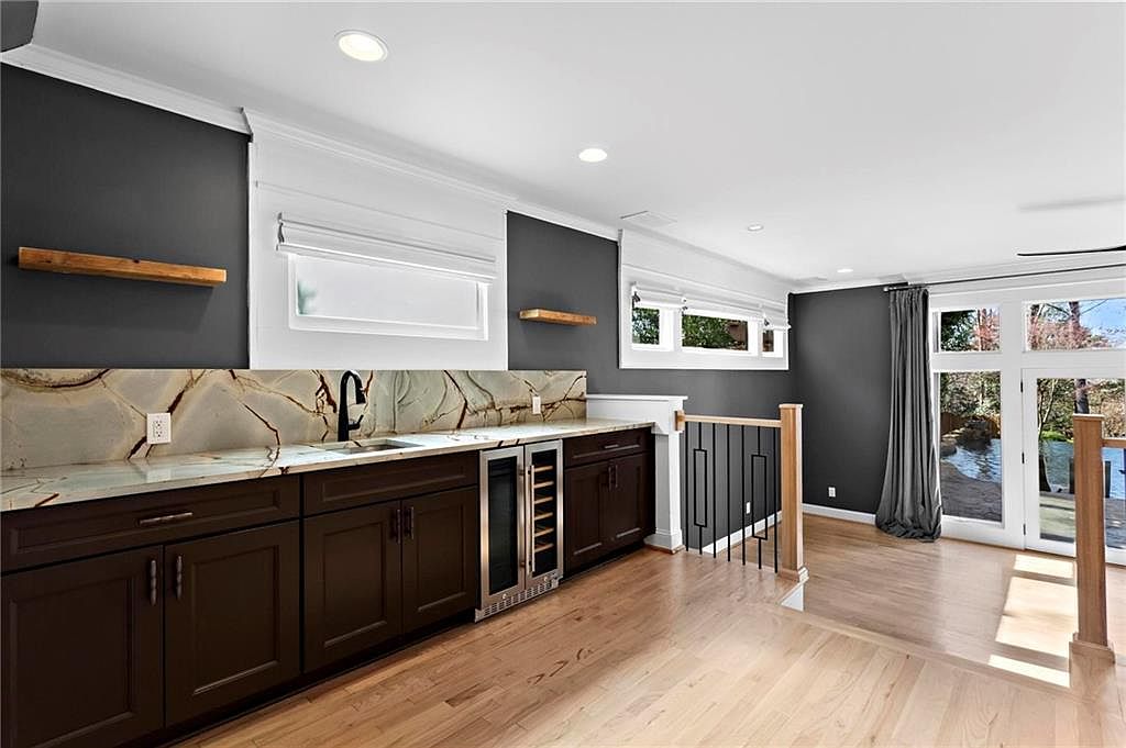 This wet bar space features a striking combination of dark cabinetry contrasted with a light, marbled countertop and backsplash that display earth-toned veins. Above the countertop, two floating wooden shelves provide open storage or décor opportunities, set against charcoal-gray accent walls which add depth to the room. Natural light filters in through horizontal windows wrapped in white trim, complementing the fresh white ceiling with recessed lighting. The flooring is light hardwood, extending seamlessly throughout the space. A small built-in wine cooler and a sleek matte black faucet enhance functionality, while the nearby glass doors open to an outdoor area, creating an inviting atmosphere perfect for entertaining.