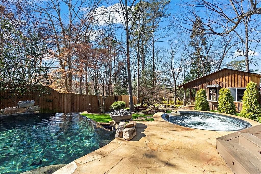 This inviting backyard features a serene pool area with a striking curved infinity edge, blending seamlessly with the natural surroundings. Adjacent to the pool is a round, bubbling spa set into smooth, beige stone paving that extends across the deck, creating a spacious lounging area. The setup is framed by tall deciduous trees and a wooden privacy fence, complemented by lush greenery and well-maintained shrubs. A cozy wooden structure with large windows adds rustic charm and functionality to the space. The overall ambiance is tranquil and nature-oriented, perfect for relaxation and outdoor entertainment under a bright blue sky.