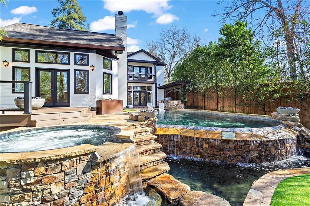 This backyard showcases a stunning multi-level pool design that blends natural stone textures with modern luxury. The elevated pool features a curved edge with water cascading into the smaller spa below, creating a soothing waterfall effect. Steps made from the same stone material provide seamless access between the pool and spa. The house exterior complements the outdoor retreat with large black-framed windows and French doors, offering abundant natural light and connection to the yard. Mature trees and a wooden privacy fence frame the space, enhancing the serene and private atmosphere. The overall design merges relaxation with sophisticated elegance.